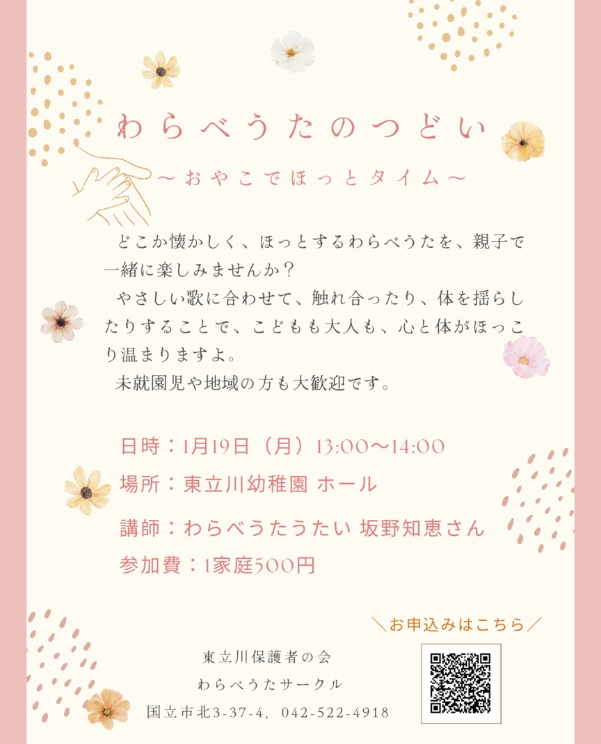 1月19日(月)13:00~14:00、本園ホールにて、保護者の会わらべうたサークル主催の「わらべうたのつどい~おやこでほっとタイム」(参加費は1家庭:500円)を開催します。わらべうたうたいの坂野知恵さんを講師に招き、子どもも大人も心と体がほっこり暖まる機会となるはずです。なお、申し込み先は https://forms.gle/ZmUrH7STwTqpPxRT8 です。どうぞ、ふるってご参加ください。